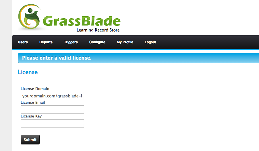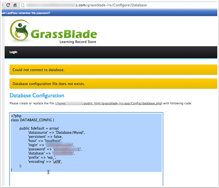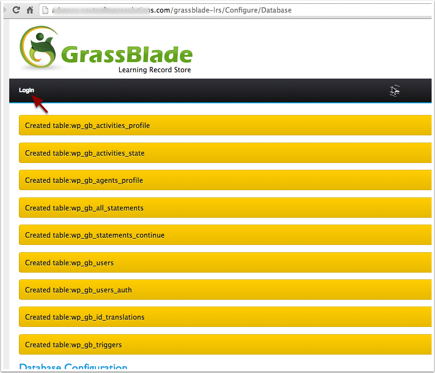 In your browser, go to: http://www.yourdomain.com/grassblade-lrs you will be redirected to http://www.yourdomain.com/grassblade-lrs/Configure/Database