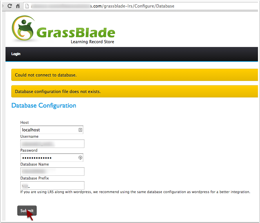 Enter your database details and click submit. Its preferred that you use the same database login details and prefix if you are planning to use the LRS with WordPress and GrassbBlade xAPI Companion plugin.