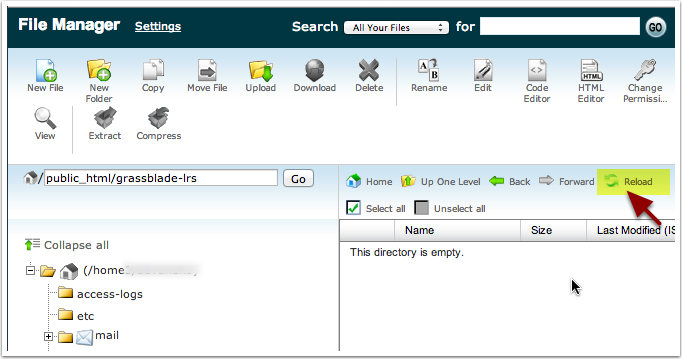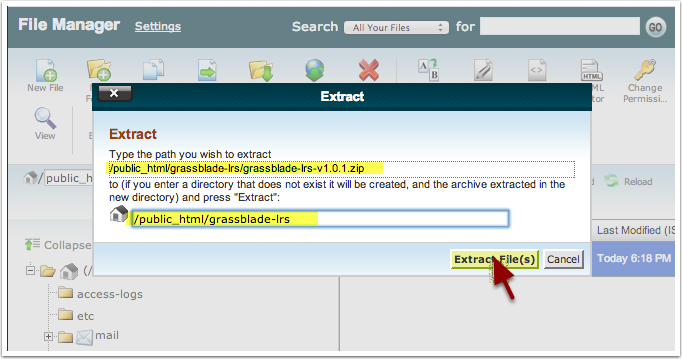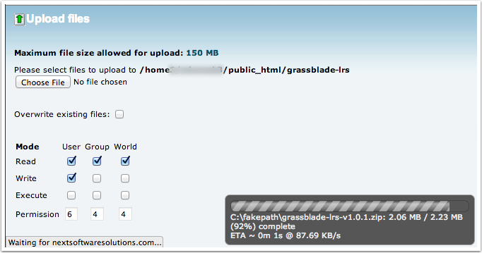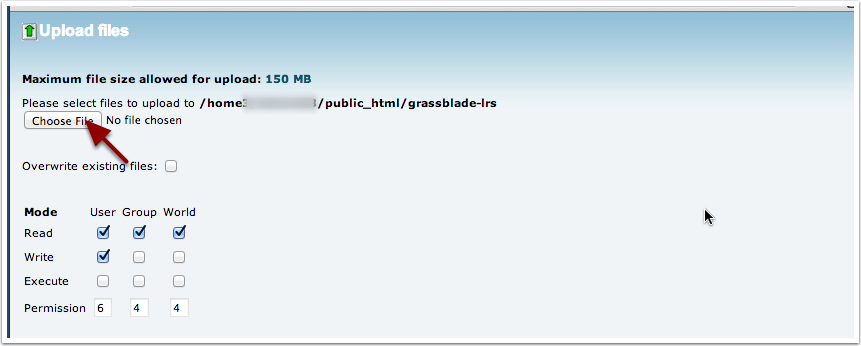 Click on Choose File and select the zipped grassblade-lrs-vX.X.X.zip file to upload. If your server download allow to unzip on the server, or if you are using FTP. Unzip the file on your desktop, and upload all the files.