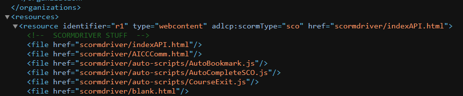 In SCORM packages, there’s an imsmanifest.xml file, similar to tincan.xml. You can open the imsmanifest.xml file to find the entry point for your SCORM content.